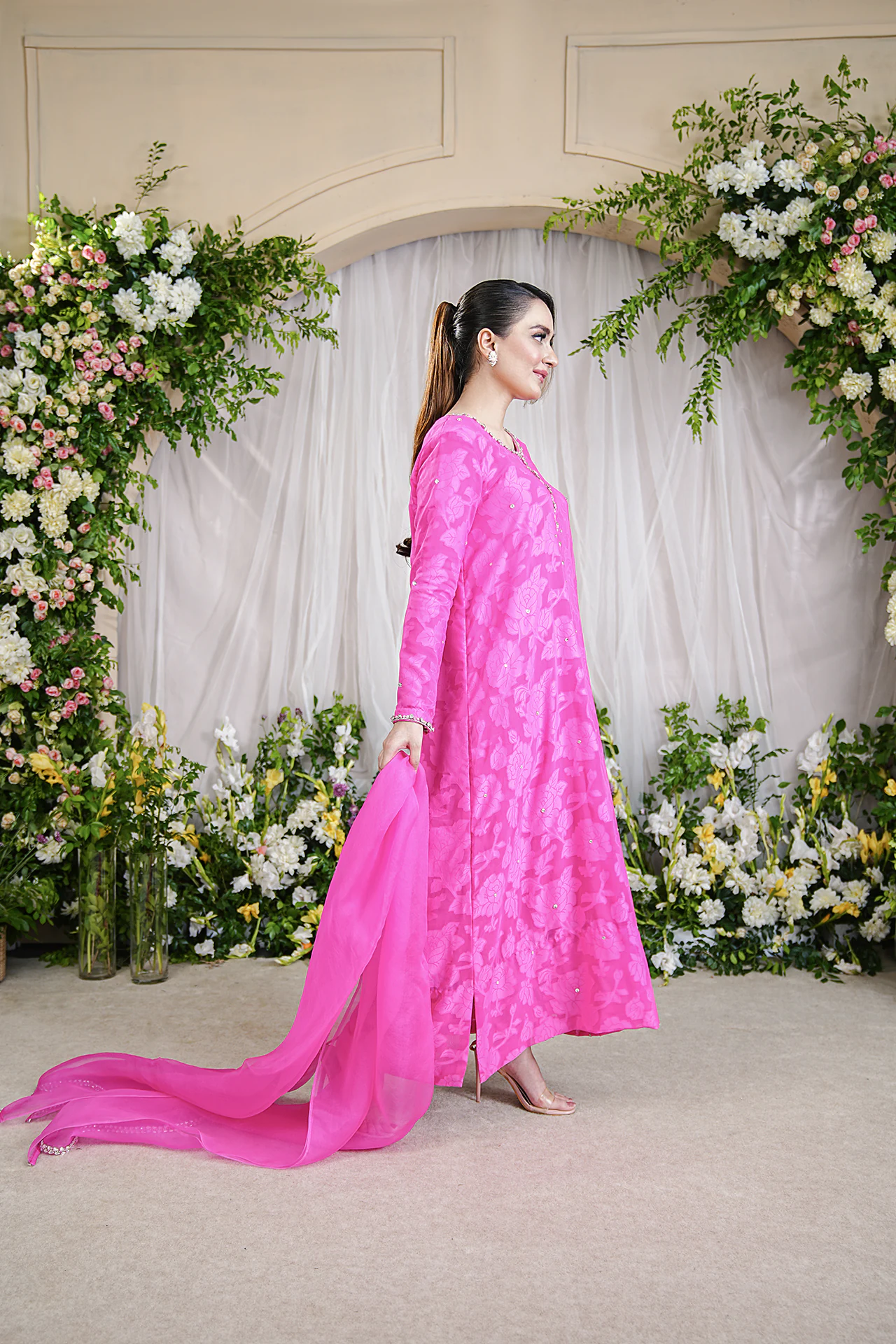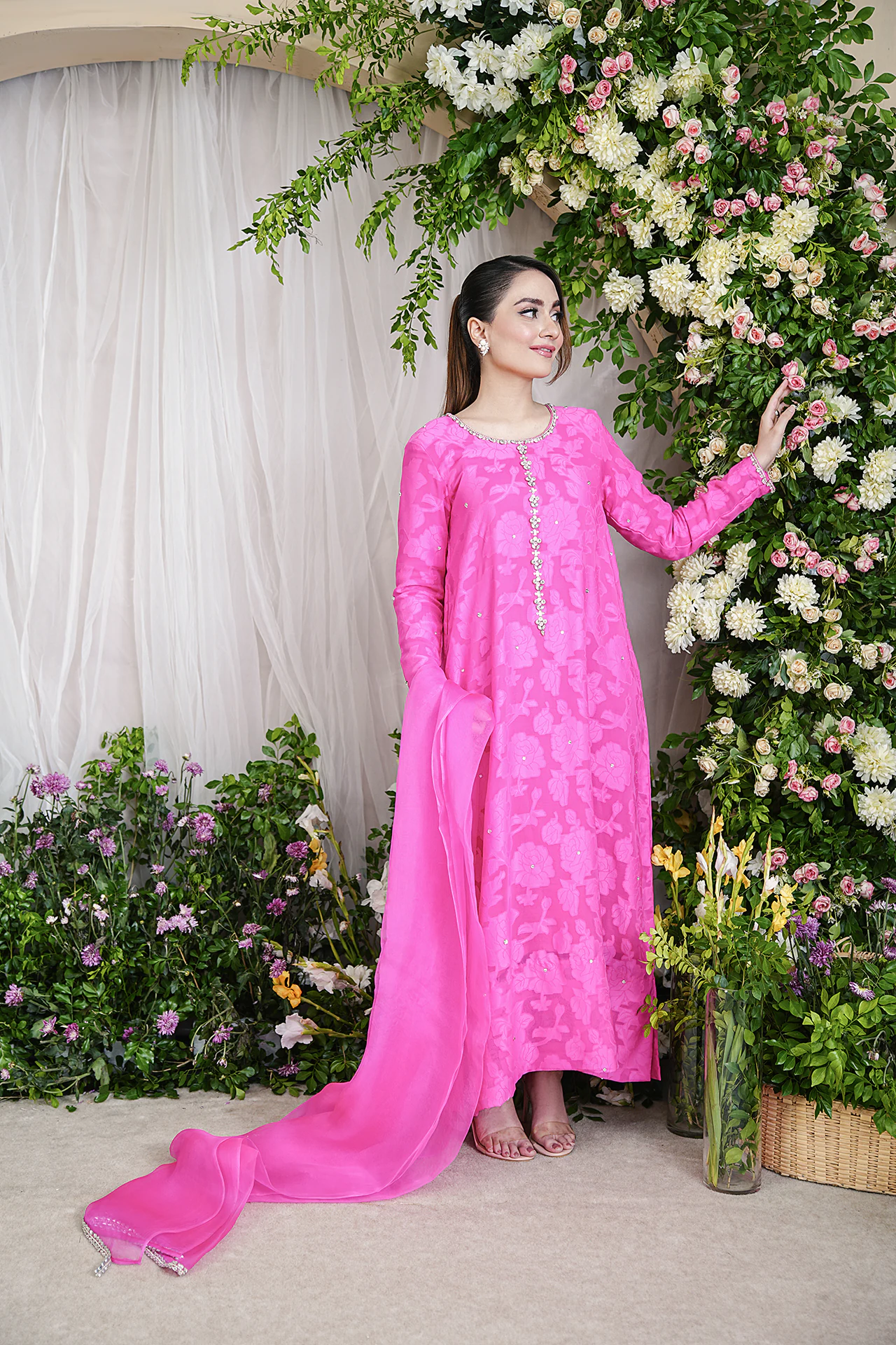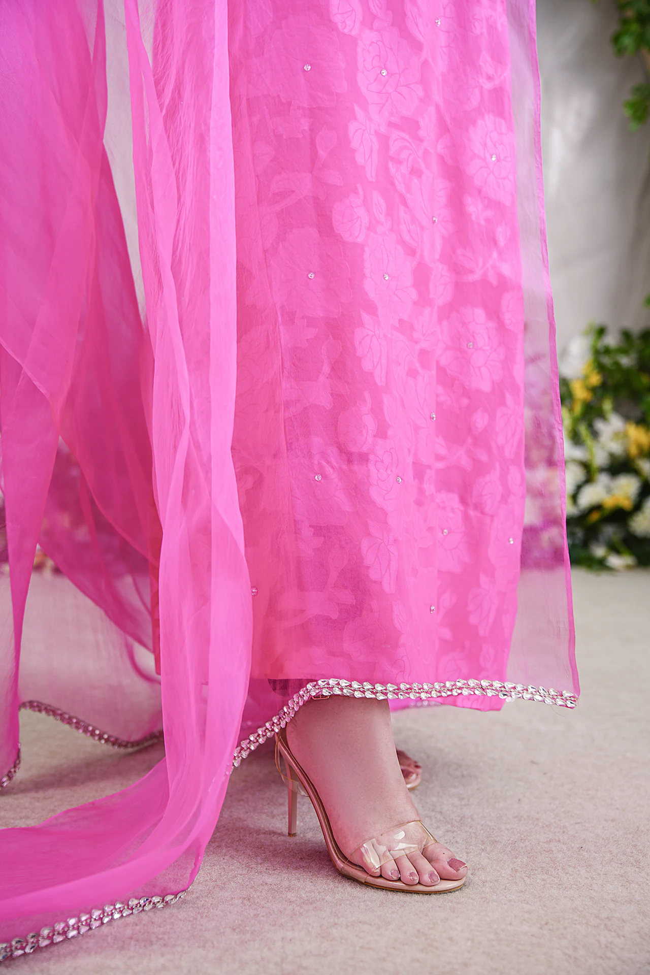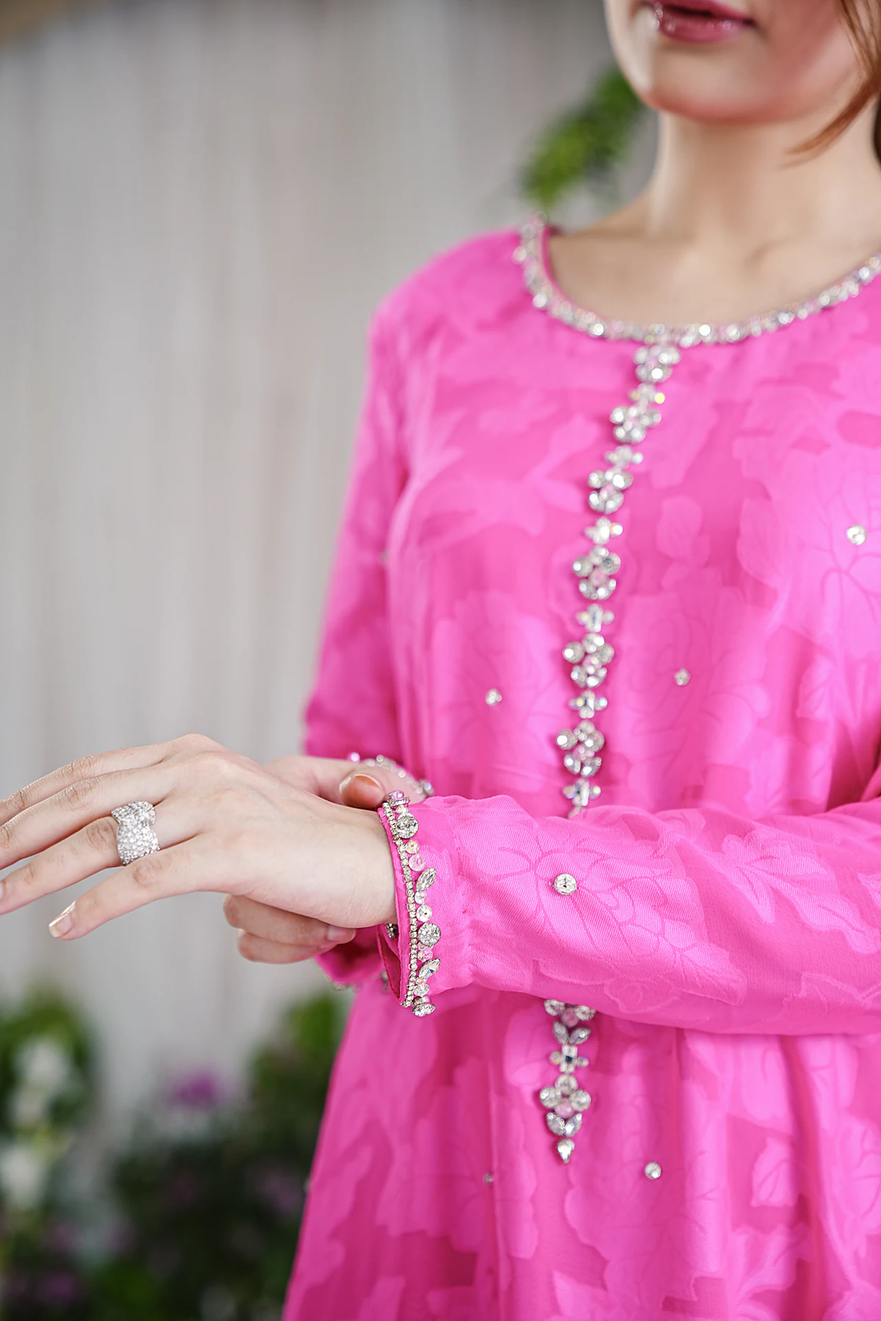 a vision in the prettiest pink. This long shirt is a masterpiece, adorned with exquisite stone, sequin, and swarovski hand embellishments that sparkle across the neck, sleeves, and entire front. Paired with a soft, pure organza dupatta, delicately embellished with stones along the edges, Rosalina offers a look of pure elegance and grace.