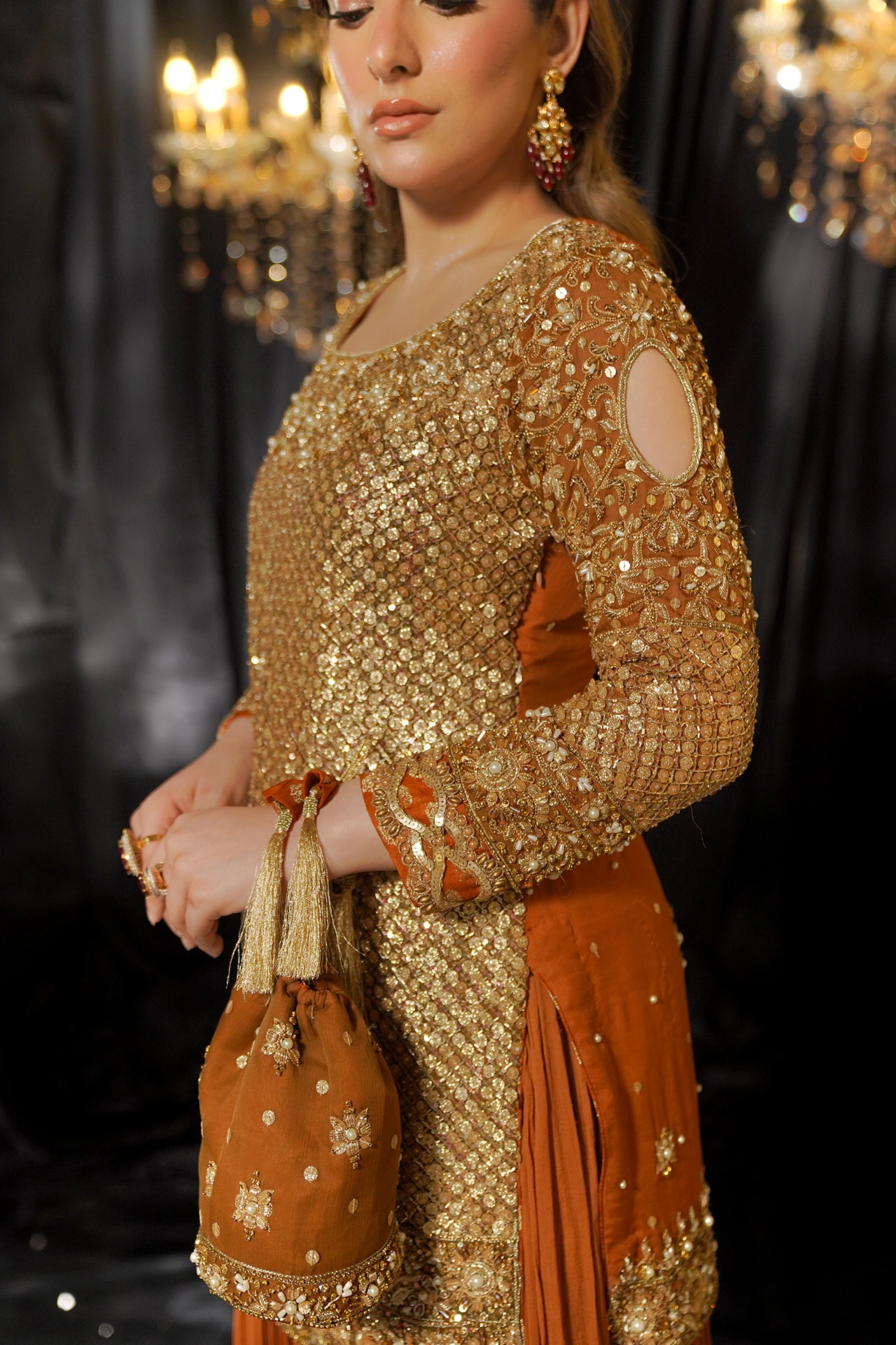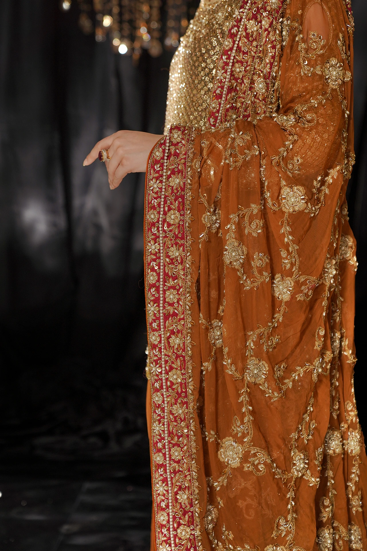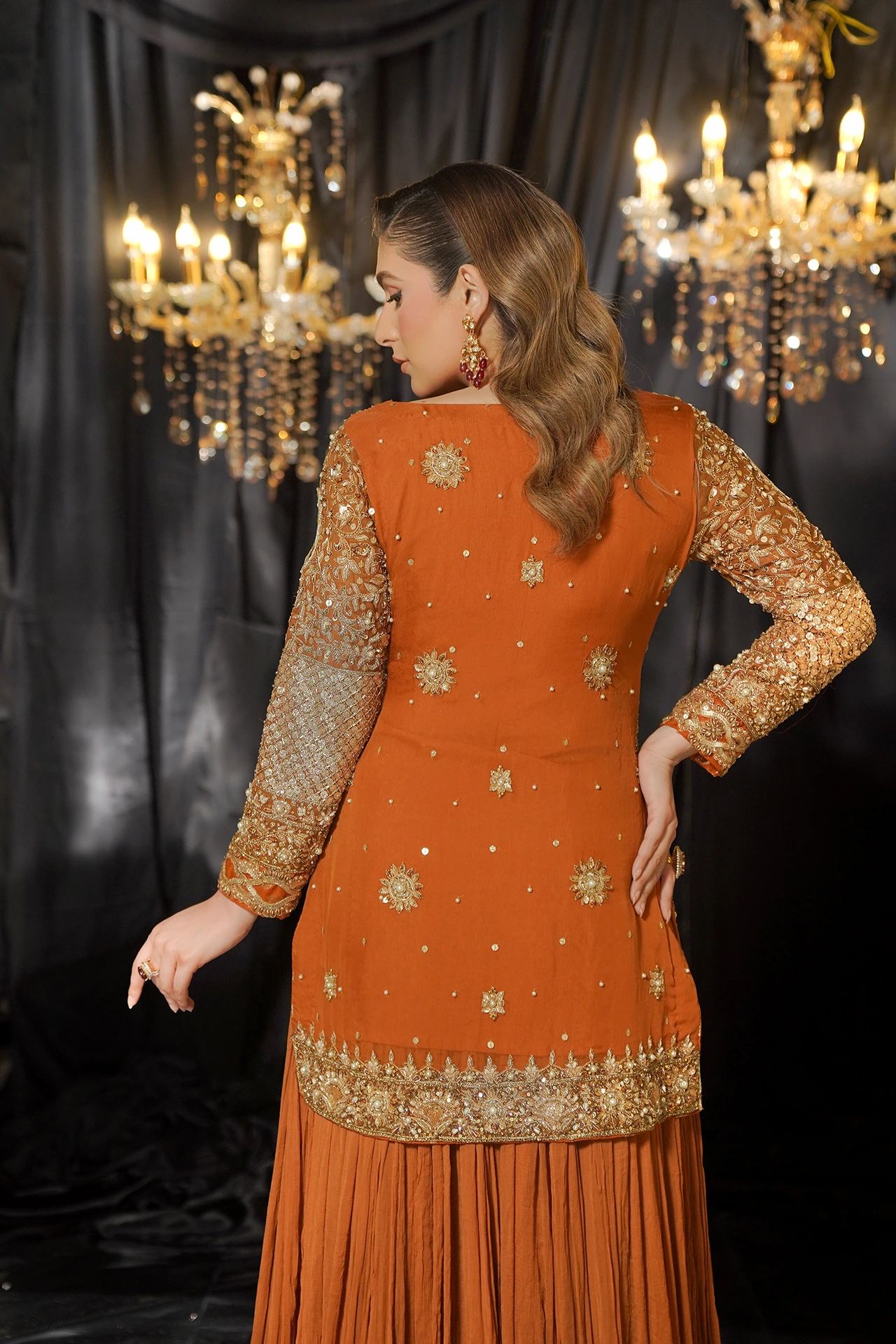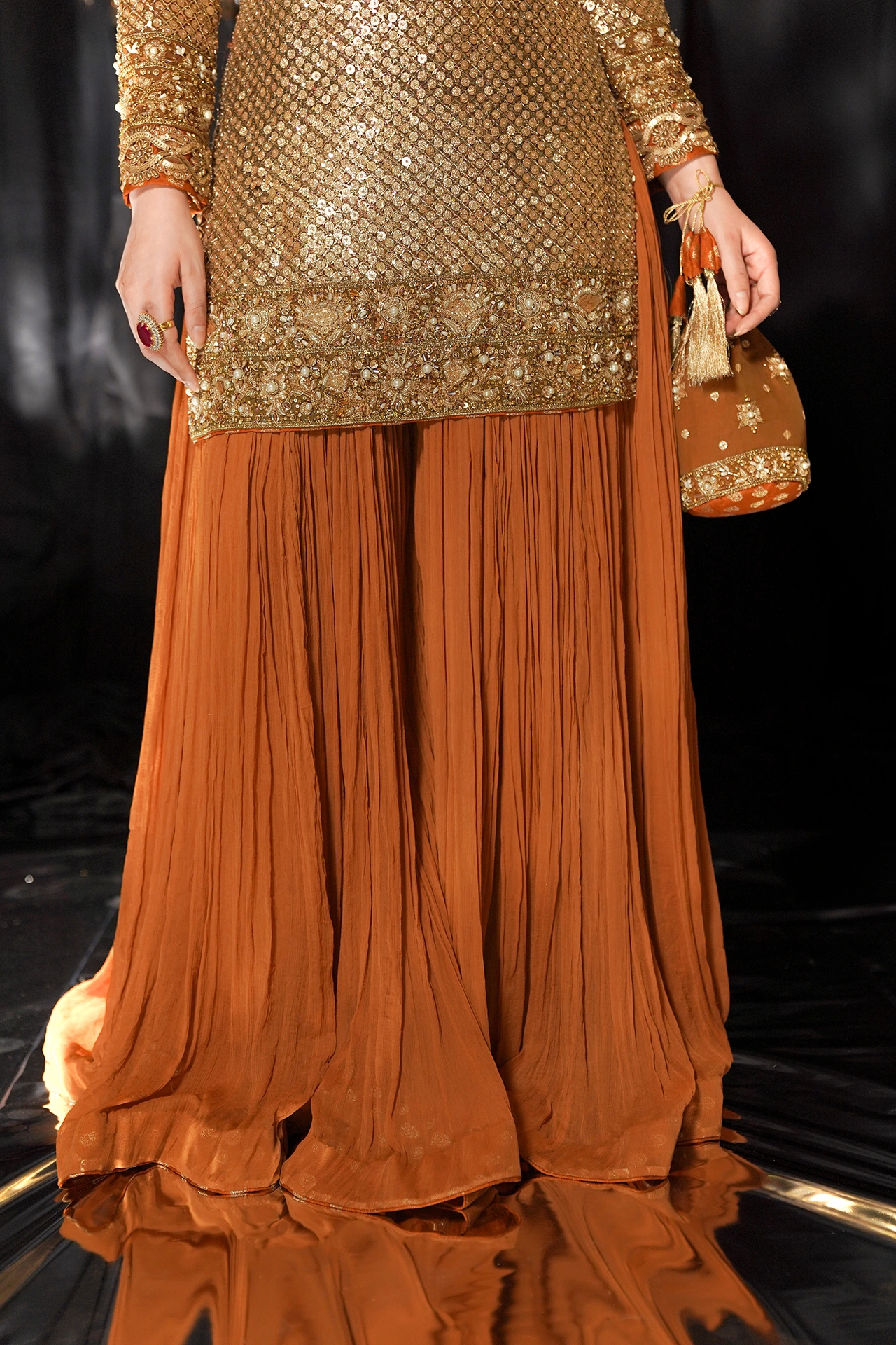 A celebration of artistry, beginning with a shirt delicately crafted with a symphony of golden sequins, each one placed by hand. The intricate detailing shimmers, catching the light with every movement. Flowing gracefully beneath, the long, flared bottoms create a silhouette of pure elegance making ‘Taaj’ the perfect choice for a Mehndi celebration.